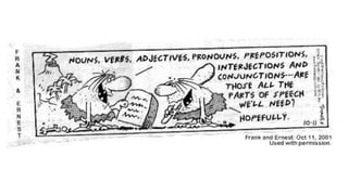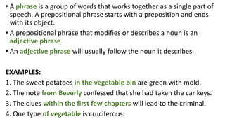 The document discusses adjective phrases and adjective clauses. Adjective phrases modify nouns and usually follow the noun they describe, starting with a preposition. Adjective clauses also modify nouns, contain a subject and predicate, do not form a complete sentence, and usually follow the noun they describe. Both adjective phrases and clauses answer questions like "which one" or "what kind" about a noun.
