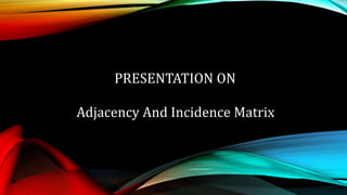This document provides information about adjacency and incidence matrices used to represent graphs. It defines what a graph is consisting of edges and vertices. Adjacency and incidence matrices are introduced as ways to represent graphs mathematically. The differences between directed and undirected adjacency matrices are explained. An example of each is shown with a graph. Incidence matrices are also defined showing the relationship between vertices and edges. The document concludes with applications of converting between these matrix representations and using them to find the shortest path.