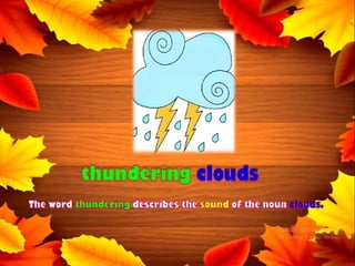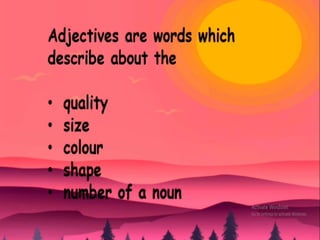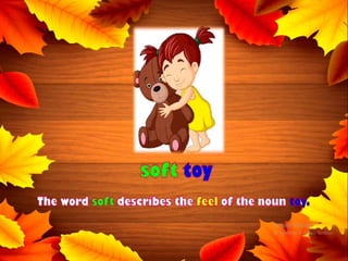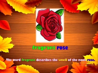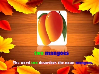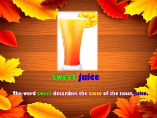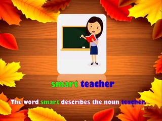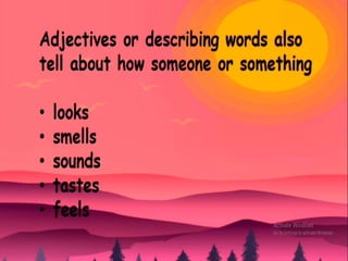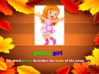 This document provides a list of 10 sentences and instructs students to identify the adjectives in each sentence. The sentences describe a girl named Ella and her appearance, noises from children, a dog, an airplane, a pillow, and shoes. Students are to read each sentence and list the adjectives that describe nouns in the sentences.