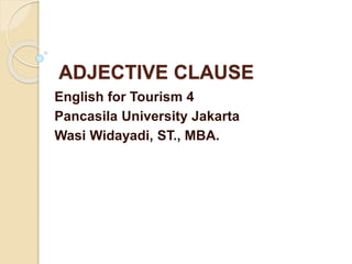 The document explains the use of adjective clauses in English, providing examples and exercises to combine sentences by using clauses that describe nouns. It highlights the structure and function of adjective clauses, emphasizing the connections between different sentence parts, such as 'who', 'which', and 'that'. The document serves as an educational resource for teaching adjective clauses, particularly in a tourism context.