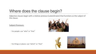 - Adjective clauses begin with a relative pronoun that functions as the subject or object of the clause. For subjects, "who" or "that" are used for people and "which" or "that" are used for things. For objects, "whom" or "that" are used for people and "which" or "that" are used for things.