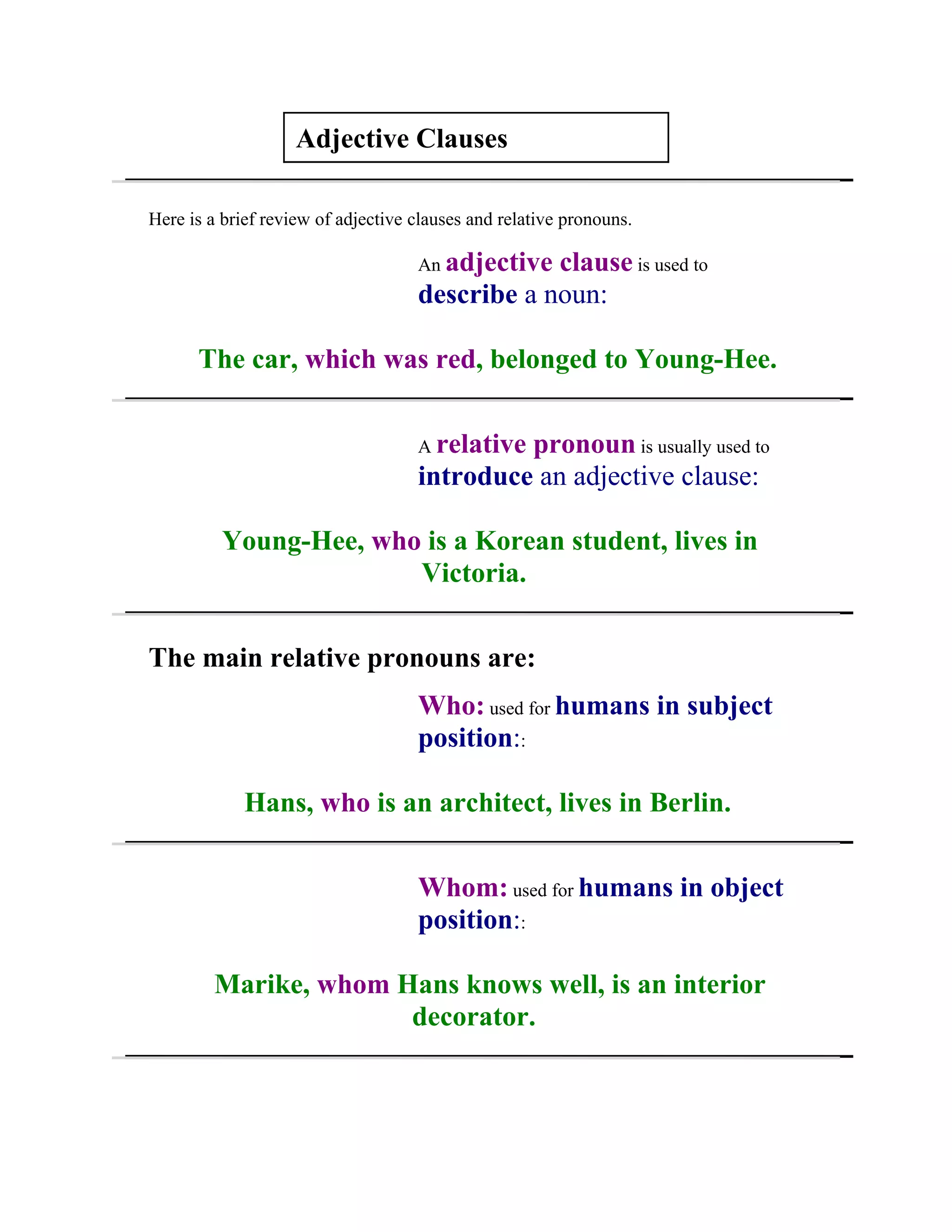 This document provides a brief overview of adjective clauses and relative pronouns. It explains that an adjective clause is used to describe a noun, and that a relative pronoun is usually used to introduce an adjective clause. It lists the main relative pronouns as who, whom, which, and that, and describes their uses. It also outlines the two main kinds of adjective clauses - non-defining clauses that provide extra information and defining clauses that give essential information about the noun.