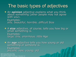 The document discusses the basic types of adjectives in Spanish. It identifies 8 types: opinion, size, age, shape, color, origin, material, and purpose. For each type it provides examples. It also shows the typical order of adjectives and includes exercises for learners to practice identifying the correct order and describing images using these adjective types.