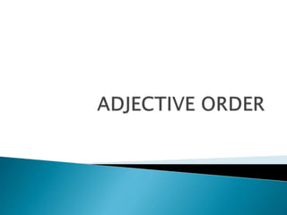 This document discusses the proper use and ordering of adjectives when describing nouns. It notes that opinion adjectives generally come first, followed by size, age, shape, color, material, origin, and purpose. However, the order can vary depending on what aspect you want to emphasize. It provides examples of strings of adjectives in typical order as well as some variations. It then gives a short adjective ordering quiz.