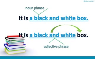 An adjective phrase is a group of words that modifies and provides more information about a noun or pronoun, consisting of an adjective and any modifiers. It functions like an adjective to describe a noun or pronoun by including adjectives, adverbs, and conjunctions. The main difference between an adjective phrase and a noun phrase is that an adjective phrase acts as an adjective by describing a noun or pronoun, while a noun phrase acts as a noun.