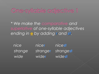 The document discusses how to form the comparative and superlative forms of adjectives in English. It provides rules for making one-syllable adjectives, two-syllable adjectives ending in 'y', and irregular adjectives like 'good' and 'bad' comparative and superlative. It also discusses using 'than' after comparatives and 'in/of/the' with superlatives. Examples are given to demonstrate correct and incorrect usage.