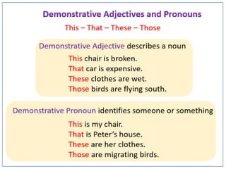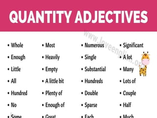 This document discusses different types of adjectives. It defines adjectives as descriptive words that modify nouns or pronouns. It then lists and provides examples of different types of adjectives including: quality adjectives like amazing; quantity adjectives like some; number adjectives like one; demonstrative adjectives like this; interrogative adjectives like what; and possessive adjectives like my. The document also notes that adjectives have three degrees - positive, comparative, and superlative - which are used to compare things.