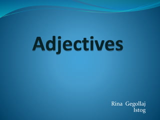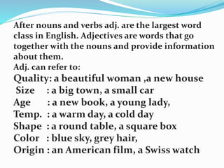 Adjectives are words that provide information about nouns, describing qualities like size, age, color, and more. In English, adjectives have the same form regardless of the number or gender of the noun. Adjectives can be simple one-syllable words, derived words formed with suffixes, participles, or compound words formed by combining two or more words. Adjectives function either attributively by coming before a noun, or predicatively by coming after a linking verb and complementing the subject.