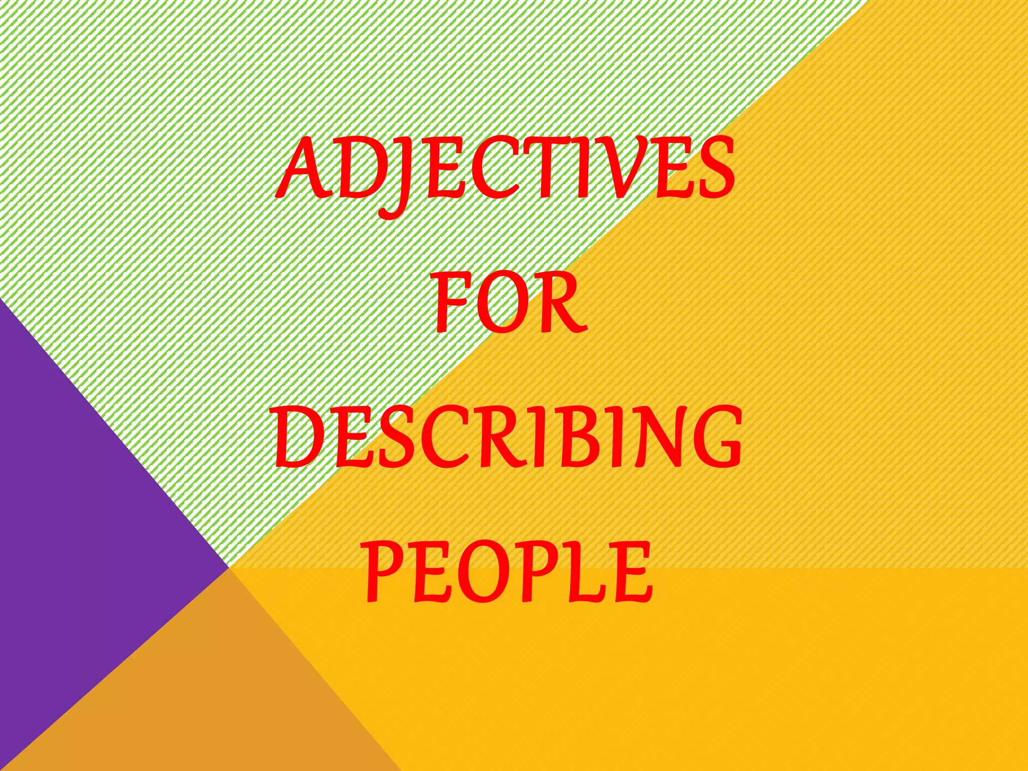 El documento proporciona una lista de adjetivos para describir a las personas, incluyendo tener un bigote o barba negra, ser un niño inteligente o travieso, o tener cabello ondulado o liso.