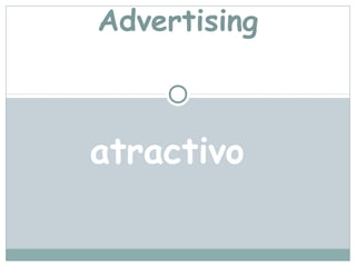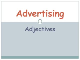This document contains a list of adjectives related to advertising with definitions provided in example sentences. Some of the adjectives included are attractive, appealing, cheap, clever, controversial, convincing, fast, genuine, inappropriate, offensive, original, powerful, precious, shocking, rare, uninspiring, upbeat, and strong. The document provides concise examples using each adjective in a sentence to demonstrate its meaning in the context of advertising.