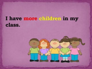 This document discusses different types of adjectives and provides examples. It explains that adjectives modify nouns and can be identified by asking "what kind," "which one," "how many," or "how much." The types of adjectives discussed are qualitative adjectives, which describe qualities like color or shape; quantitative adjectives, which describe quantity for uncountable nouns; adjectives of number, which describe countable nouns; and demonstrative adjectives, which point out specific nouns. Examples are provided for each type of adjective.