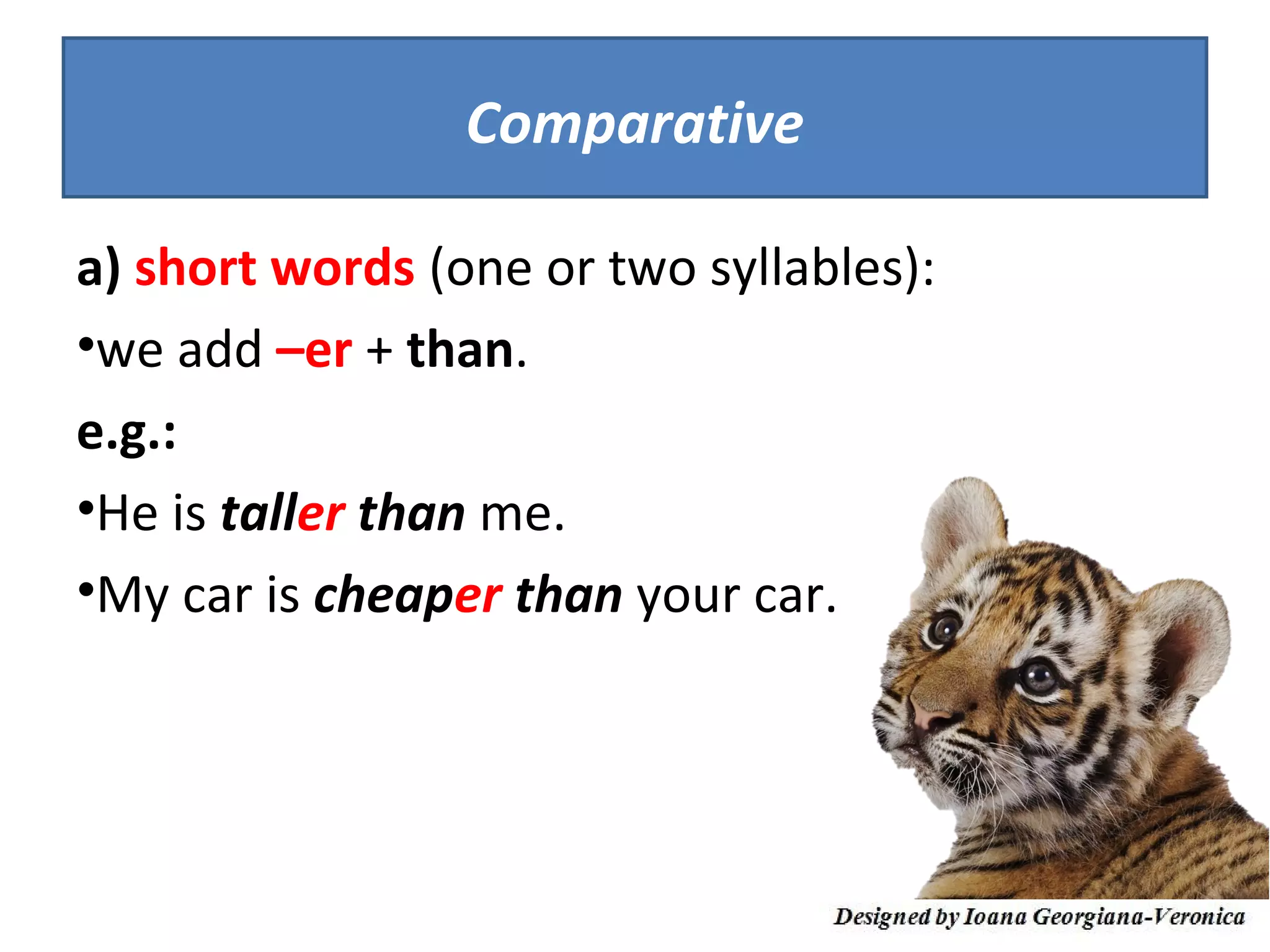 Comparative adjectives are formed by adding "-er" for short words, doubling the final consonant and adding "-er" for words ending in a vowel+consonant, or changing "y" to "i" and adding "-er" for adjectives ending in "y". Superlative adjectives are formed by adding "the + adjective + -est" for short words, doubling the final consonant and adding "-est" for words ending in a vowel+consonant, or using "the most" for long words. Irregular adjectives have unique forms for comparative and superl
