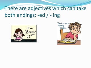 This document discusses the difference between adjectives ending in "-ed" and "-ing" in English. Adjectives ending in "-ed" describe a state or how someone is feeling in a situation, while adjectives ending in "-ing" describe a quality or characteristic that causes that state. It provides examples of words like "bored" and "boring" to illustrate that "-ed" describes a state of being bored, while "-ing" describes the quality of something being boring which leads to that bored state. The document encourages practicing distinguishing between these adjective endings.