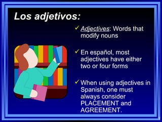 This document discusses adjectives in Spanish. It explains that most Spanish adjectives have two or four forms depending on whether they end in O, A, OS or AS. It discusses the placement of adjectives in relation to nouns, including restrictive adjectives preceding nouns and descriptive adjectives following nouns. The document also covers agreement of adjectives with nouns in terms of number and gender. Examples are provided to illustrate adjective forms and placement.