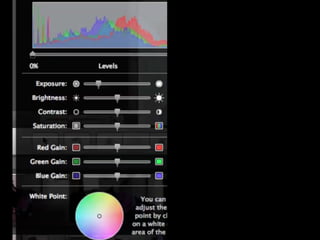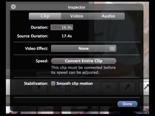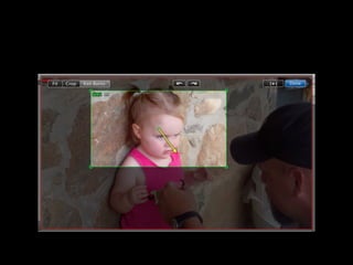This document contains instructions for adjusting images and video clips in a video editing program. It includes options for changing color settings, volume control throughout and within clips, adding text, rotating and cropping clips, and using the Ken Burns effect to zoom and pan within a clip over time. The user can select different video effects and tools by clicking on options in the left column.