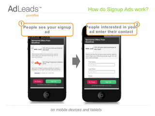 Signup ads show people interested in a business within mobile apps. Users who see these ads and want more information can enter their contact details, and will immediately receive a welcome email created by the business. The signups are then available each day for download and follow up through the business's AdLeads account, allowing them to promote news, deals and sales to new contacts.
