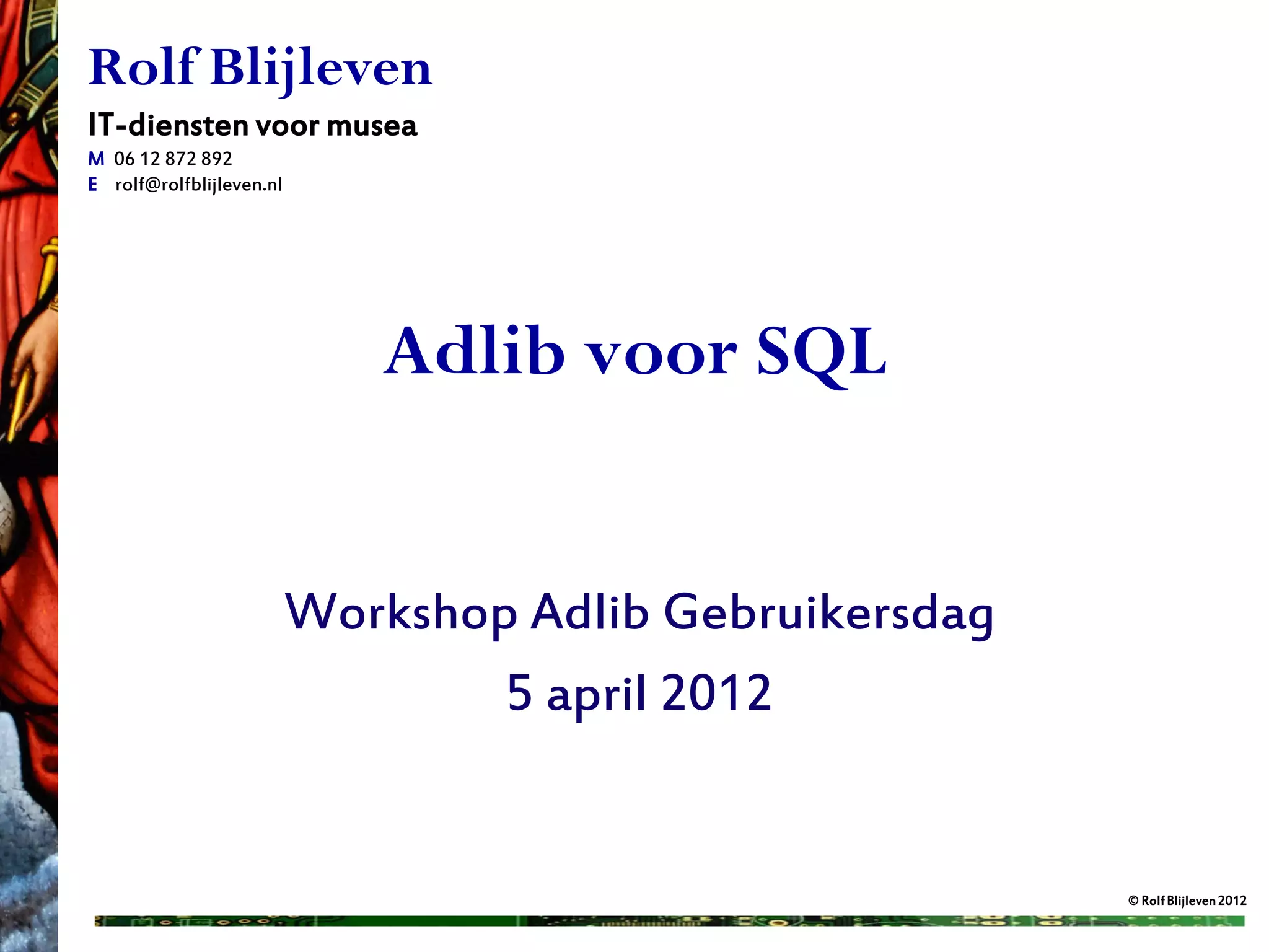 musea M 06 12 872 892 E rolf@rolfblijleven.nl Adlib voor SQL Workshop Adlib Gebruikersdag 5 april 2012 © Rolf Blijleven 2012