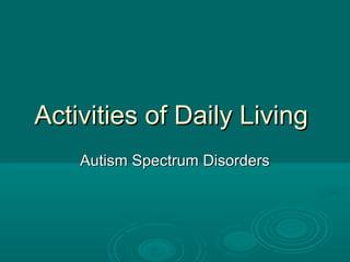 This document discusses the importance of teaching activities of daily living (ADL) skills to individuals with autism at an early age. It describes several key ADL skills including toilet training, eating habits, bathing, and dressing/undressing. For each skill, it provides strategies for breaking down tasks, addressing sensory issues, using visual supports and reinforcement, and gradually fading prompts. The goal is to promote independence by properly organizing instruction of essential life skills.
