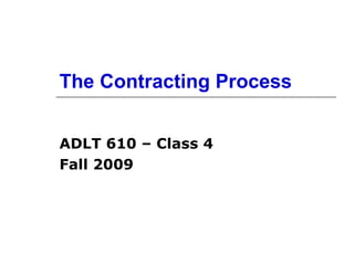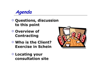 The document provides an overview of the contracting process for process consulting. It discusses identifying the client and their various roles, such as primary, intermediate, unwitting, and non-clients. It also covers the consultant's responsibilities and potential reactions, as well as engaging the client through different levels of inquiry. Key aspects of the contracting process that are outlined include determining objectives, deliverables, timelines, and communication. Questions clients may ask are also presented.