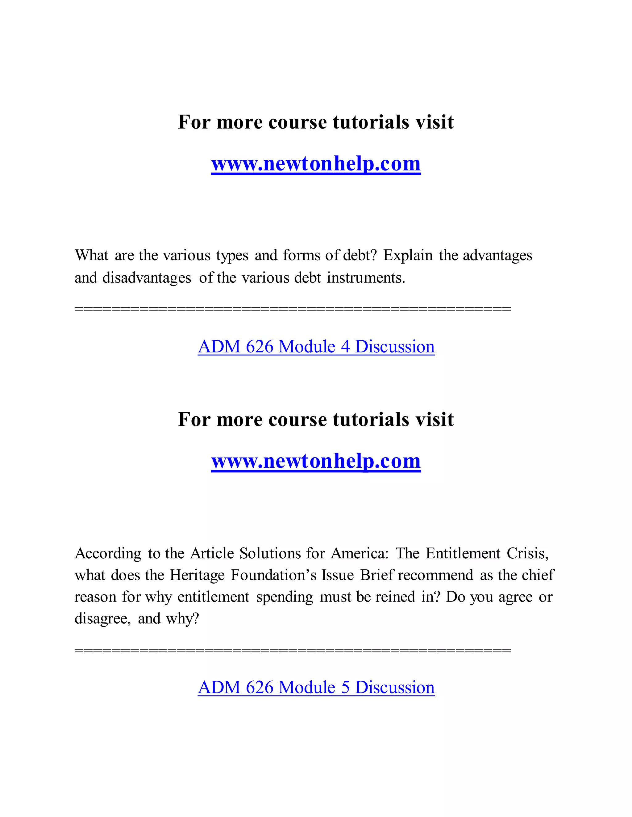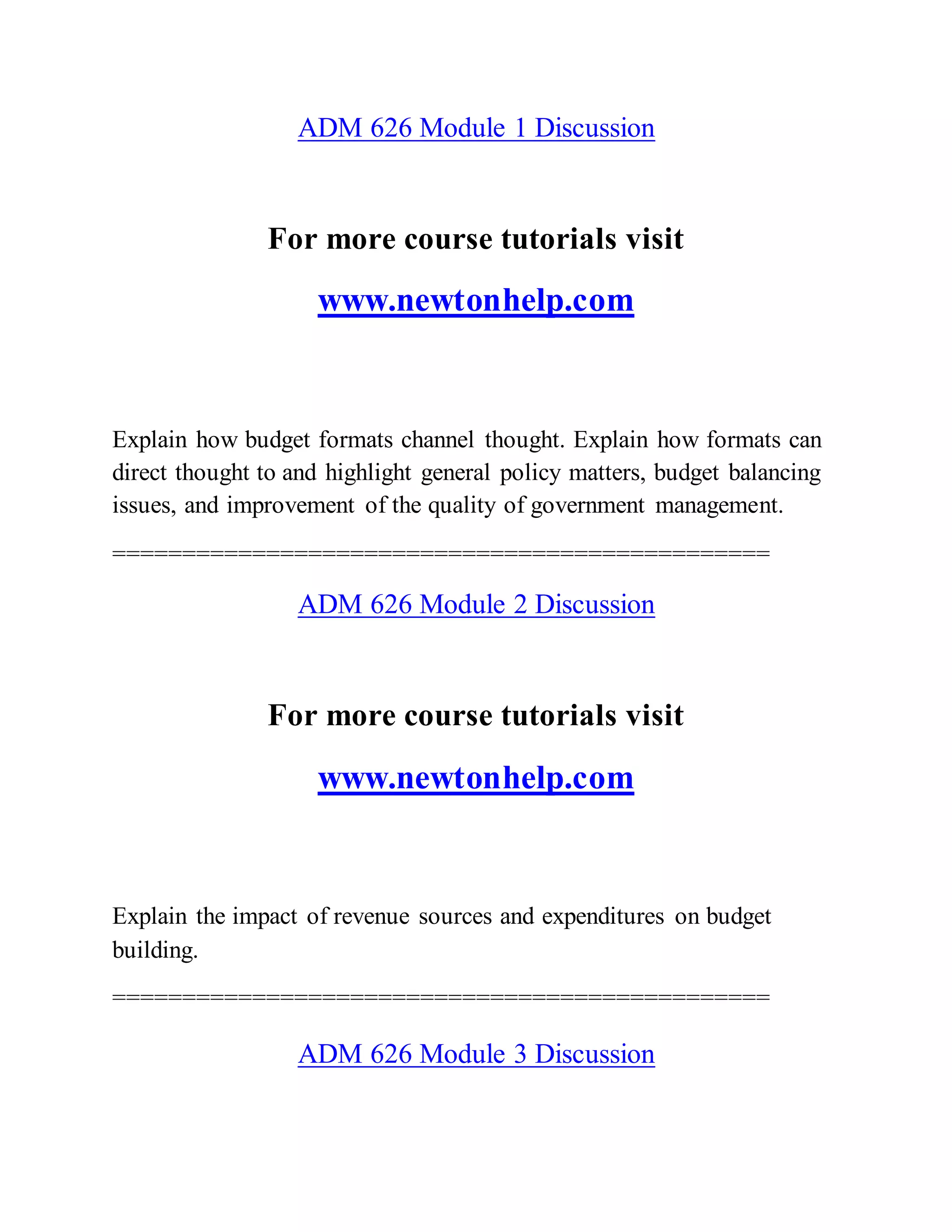 The document outlines various discussions and assignments for an ADM 626 course, focusing on budgeting, public administration, and financial management in the context of a financial crisis faced by the town of Hadleyville. It emphasizes understanding budget formats, revenue sources, debt types, performance audits, and risk management while encouraging students to engage in group projects to propose solutions for the town's economic issues. Each week's theme builds on assessing the financial impact on public services and formulating proposals to mitigate the crisis.