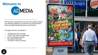 This document summarizes the out of home advertising opportunities provided by a company with 20 years of experience. They operate static and digital advertising across various formats in motorway service areas, pubs/bars/nightclubs, shopping centers, rail sites, and Kwik Fit service centers. The summary highlights the large audience reach, including over 56 million consumers visiting motorway service areas every 4 weeks and 5 million footfall annually at Kwik Fit centers. It also notes the engaged audiences that spend significant time viewing ads in these locations.