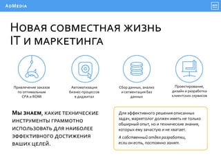 Документ описывает услуги и подход компании в области маркетинга и e-commerce, акцентируя внимание на важности технической экспертизы и оптимизации рекламных кампаний. Упоминаются успешные проекты и сотрудничество с известными брендами, а также результаты, достигнутые благодаря автоматизации и анализу данных. Компания предлагает инновационные решения для улучшения показателей эффективности бизнеса.