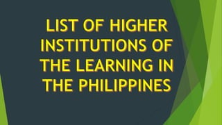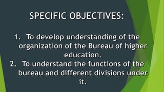 The document summarizes the organization and establishment of the Bureau of Higher Education in the Philippines. It was created based on recommendations from a 1970 presidential commission to better coordinate public and private higher education. The Bureau is headed by a Director and divided into divisions focusing on student services, staff development, and physical facilities. It also establishes a Board of Higher Education to set uniform standards across institutions and works to improve education quality through accreditation and cooperation between public and private universities.