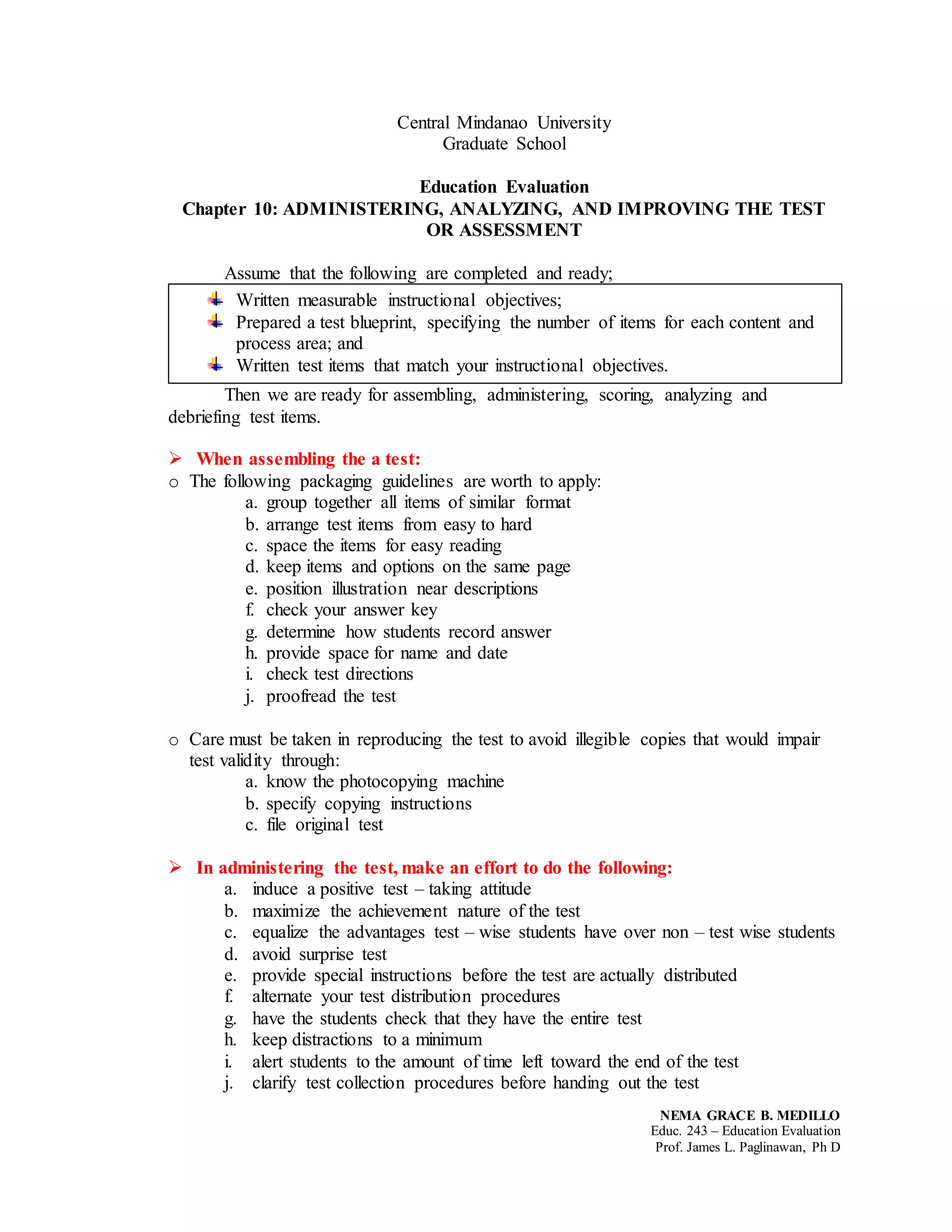 The document provides guidance on administering, analyzing, and improving tests and assessments. It discusses assembling tests by grouping similar item formats and arranging items from easy to hard. When administering tests, steps should be taken to induce a positive testing attitude and minimize distractions. Tests should be scored carefully and item analysis conducted to identify problematic items in need of revision or elimination. Both quantitative and qualitative item analysis methods are described. The goal is to analyze test items, identify areas for improvement, and ensure the test effectively measures the intended objectives.
