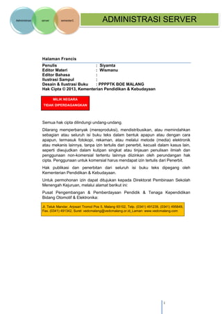 Dokumen ini adalah buku teks untuk mata pelajaran Administrasi Server di SMK, yang disusun berdasarkan kurikulum 2013 dengan pendekatan pembelajaran abad 21. Buku ini mencakup berbagai kegiatan belajar dan materi terkait analisis kebutuhan server, tugas dan tanggung jawab admin server, serta prinsip kerja komunikasi client-server. Penerbit mengingatkan bahwa kebenaran isi buku adalah tanggung jawab penulis dan tidak ada jaminan dari penerbit.