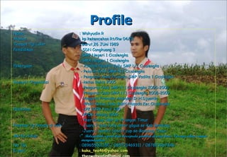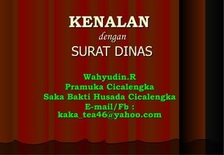 Dokumen ini berisi tentang profil Wahyudin, mencakup informasi pribadi, pendidikan, pengalaman kerja, riwayat organisasi, pelatihan, dan prestasi yang dicapai. Selain itu, dokumen ini juga menjelaskan tentang tata cara penulisan surat dinas, termasuk bagian-bagian surat, format, dan syarat-syarat isi surat yang baik. Terdapat penjelasan mendetail mengenai berbagai jenis surat, seperti surat permohonan, surat keterangan, dan surat tugas.