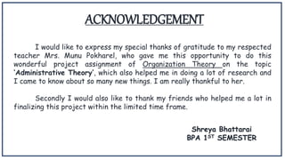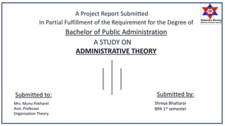 This project report summarizes an administrative theory study submitted for a bachelor's degree in public administration. The report acknowledges the teacher for the opportunity and friends for their help. It then defines Henry Fayol's administrative theory, outlining its 14 principles of management. These principles focus on topics like division of work, authority, and discipline. The report discusses advantages like efficiency and control, and disadvantages such as bureaucracy and inflexibility. It concludes that administrative theory provides a comprehensive management approach but has limited applicability to non-profits.