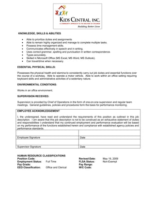 This job description outlines the responsibilities of an Administrative Assistant position at Kids Central, Inc. The Administrative Assistant provides office management, administrative, and clerical support to ensure day-to-day operations run smoothly. Duties include coordinating meetings, managing calendars, answering phones, organizing files, completing registrations, and assisting the Chief of Operations. Qualifications include previous secretarial experience, Microsoft Office skills, and a background screening.