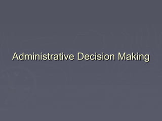 The document describes different models of administrative decision making including the classical model, administrative model, incrementalism, mixed scanning approach, and garbage can theory. It contrasts the classical and administrative models, noting how the administrative model recognizes limitations in rationality due to bounded rationality and imperfect information. Incrementalism and mixed scanning are presented as alternatives that combine rational and incremental approaches. The role of intuition and various heuristics in decision making are also discussed.