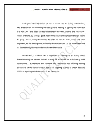 Quality circles are voluntary groups composed of employees who meet regularly to identify, analyze, and develop solutions to work-related problems. They are designed to improve organizational performance and motivate employees. Quality circles utilize techniques like brainstorming, flowcharts, checksheets, and cause-and-effect diagrams to systematically identify issues, analyze root causes, and develop solutions. When implemented effectively with management support, quality circles can result in benefits like improved employee engagement, problem-solving skills, communication, quality, productivity, and workplace morale.