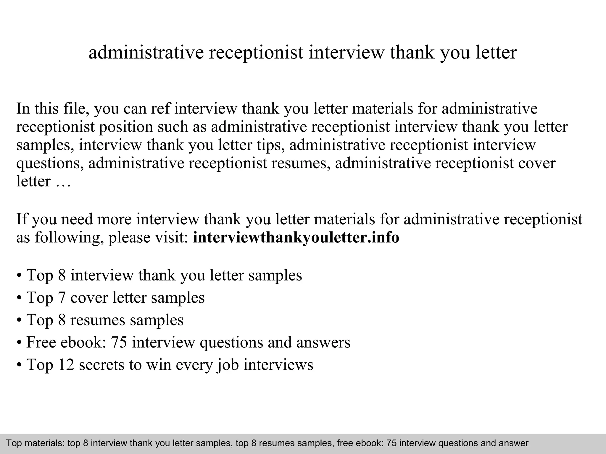 The document provides resources and samples for writing interview thank you letters, specifically for administrative receptionist positions. It includes tips on how to express gratitude, emphasize qualifications, and make a lasting impression. Additional materials such as sample letters, resumes, and interview questions are available from the provided website.