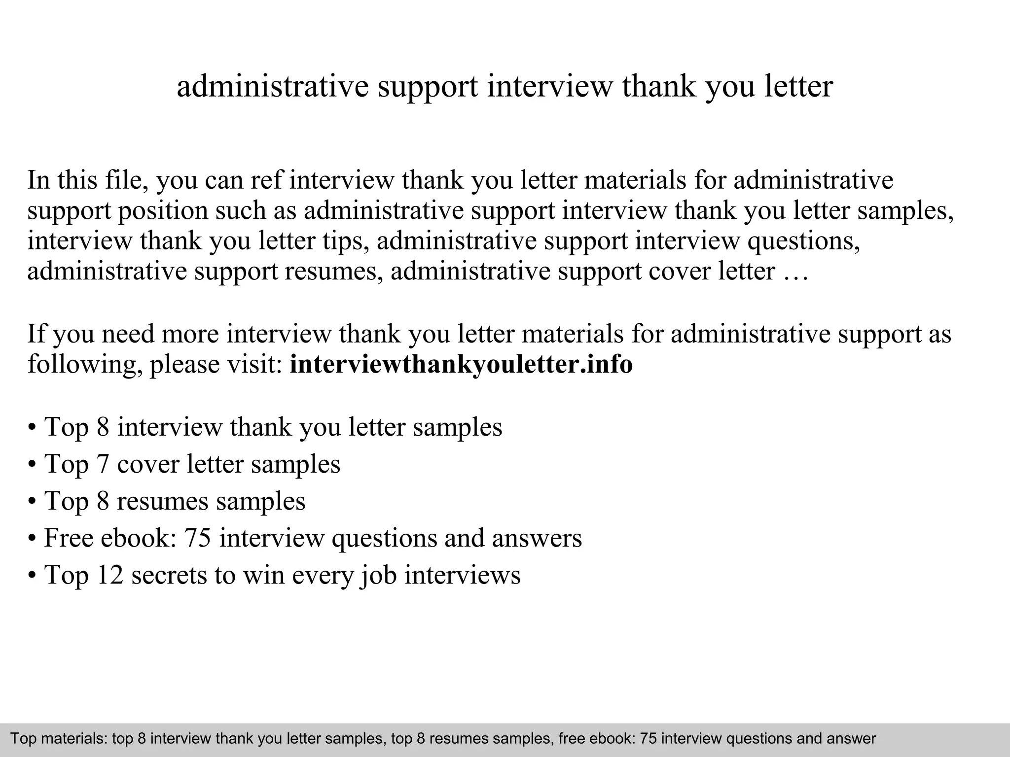The document provides guidelines and materials for writing thank you letters after interviews for administrative support positions, including samples, tips, and additional resources. It emphasizes the importance of sending these letters promptly and personalizing them to make them stand out. Key components to include in the letters are expressions of gratitude, reiteration of interest in the job, and a summary of qualifications.