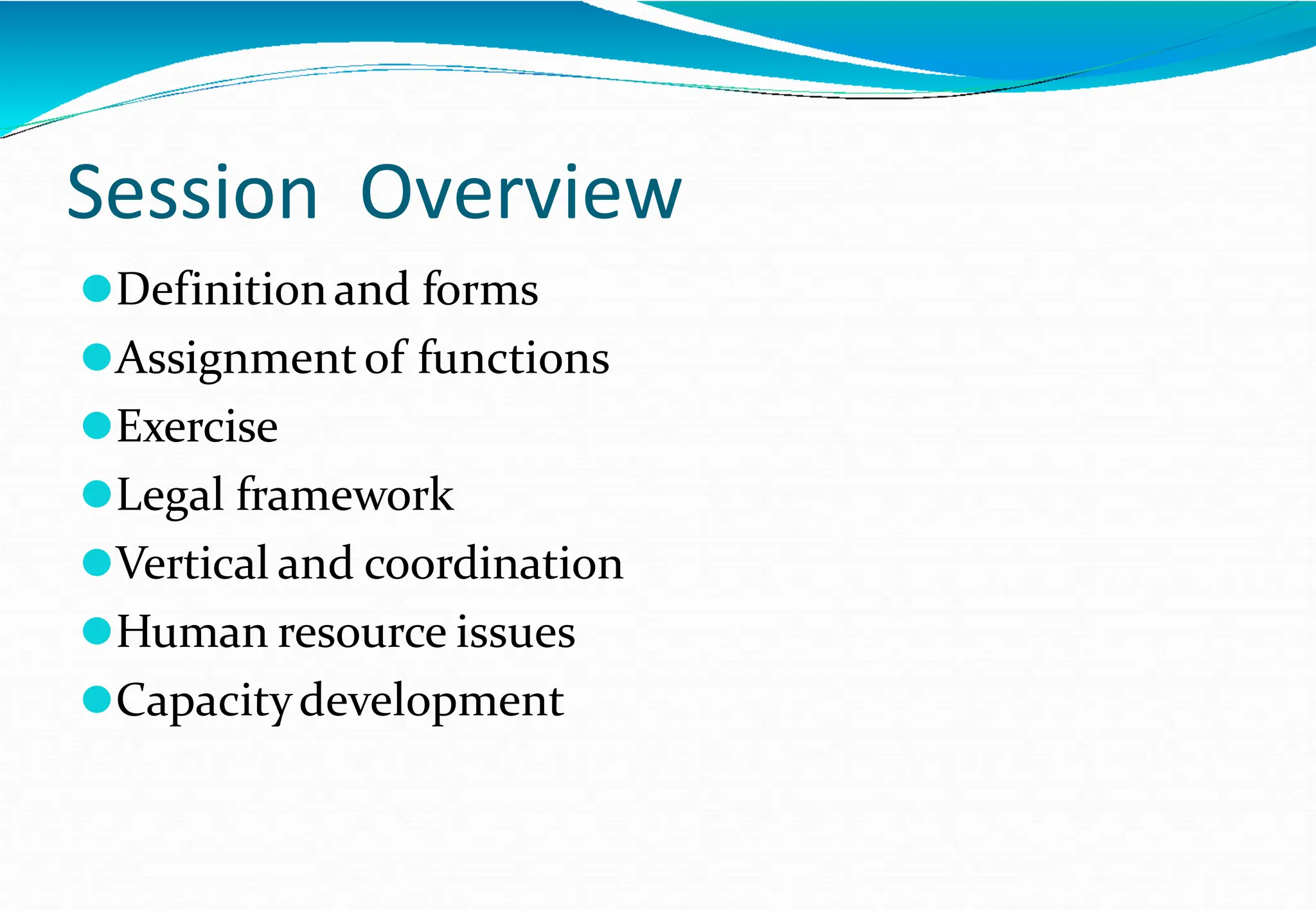 The document discusses the concepts and frameworks surrounding administrative decentralization, emphasizing the transfer of responsibilities from central to local governments while addressing governance structures, legal frameworks, and human resource issues. It outlines forms of decentralization such as deconcentration, delegation, and devolution, alongside principles for assigning public service functions to optimize efficiency and accountability. Challenges of implementation are highlighted, particularly in terms of coordination and capacity development, alongside strategies to promote effective local governance.
