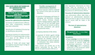 This document provides information for individuals who have been detained through an administrative procedure in Ukraine. It outlines their rights, including the right to a public lawyer, to be informed of the reasons for detention, to notify others of their detention, and to appeal any illegal actions. It also lists obligations, such as being polite and fulfilling legal requests. The document explains the reasons a person may be detained administratively, potential consequences like searches or license seizures, and generally detention is not to exceed three hours with exceptions for certain offenses. Overall, the document aims to inform detainees of their rights and explain the administrative detention process in Ukraine.