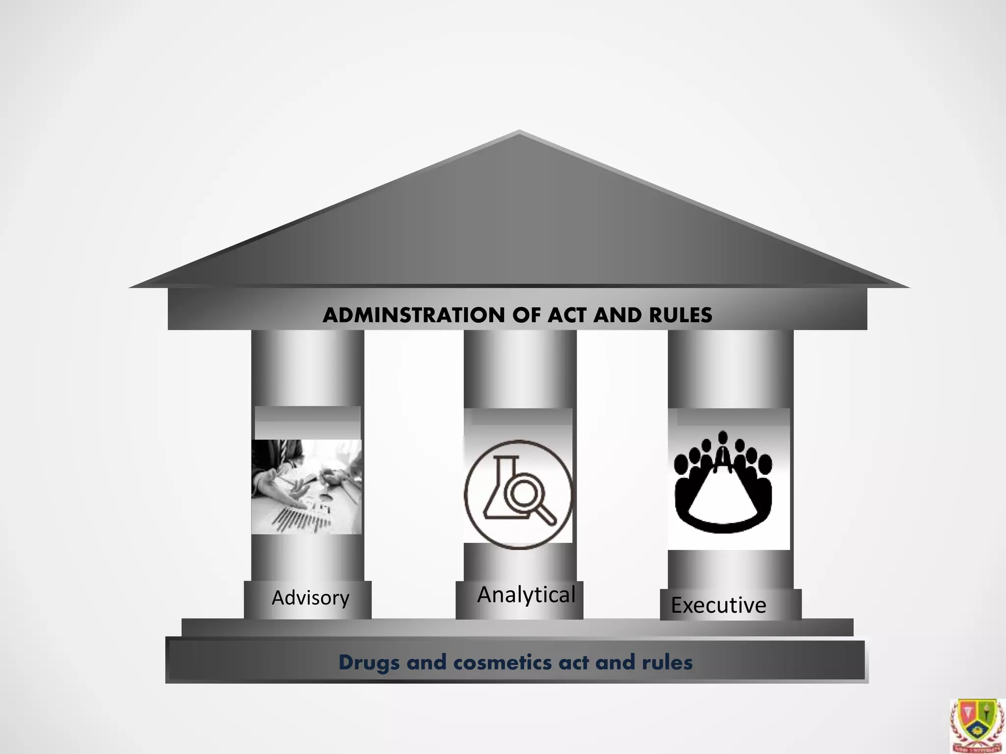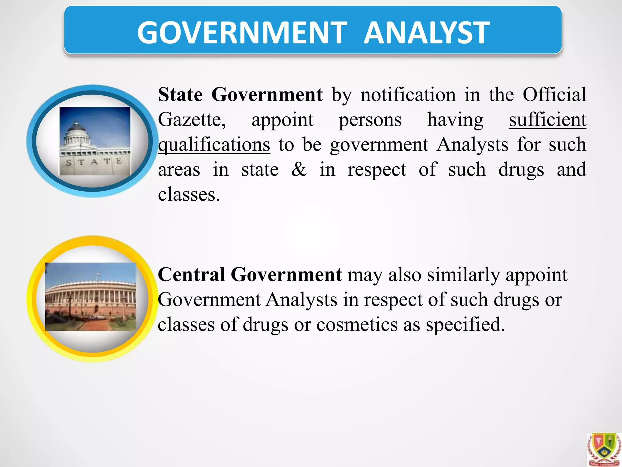 The document discusses the administration of the Drugs and Cosmetics Act and Rules in India. It outlines the roles and qualifications of government analysts, drugs inspectors, and their powers and duties. Government analysts are appointed by state and central governments to analyze drug and cosmetic samples. They must have qualifications in medicine, science, pharmacy or pharmaceutical chemistry. Drugs inspectors inspect premises where drugs are manufactured and sold. They collect samples, examine records, and seize stocks if needed. Inspectors investigate complaints and work to detect illegal drug sales.