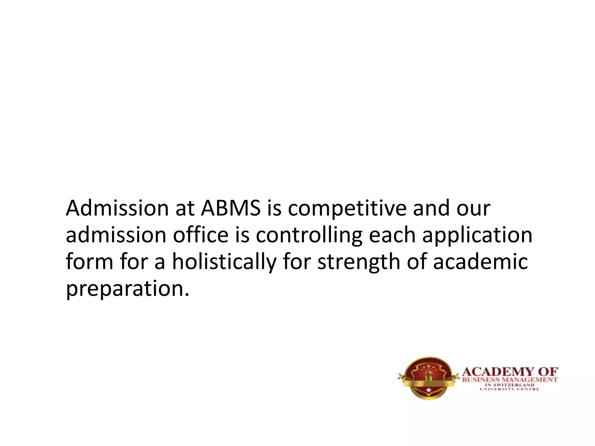 ABMS University has a competitive admission process that holistically reviews each application for academic strength. There are 4 intakes per year in January, April, July, and October. The university offers associate, bachelor's, executive bachelor's, master's, executive master's, DBA, and doctorate degrees with varying admission requirements for minimum age, previous education experience, English language proficiency, program duration and fees. For any questions about eligibility, applicants can contact the admission office.