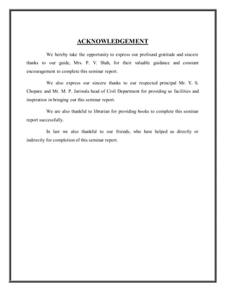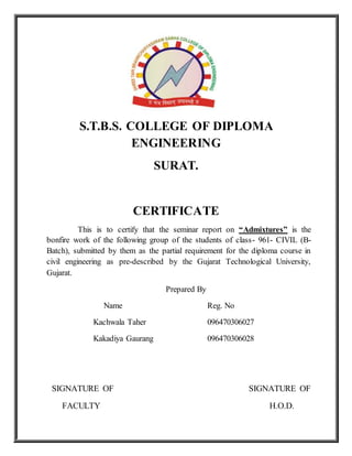 This document provides a summary of admixtures used in concrete. It defines admixtures as organic or inorganic materials added in small quantities to modify the properties of mortar. The main types of admixtures discussed are accelerators, retarders, plasticizers, super plasticizers, and air entraining admixtures. Accelerators increase the speed of setting and hardening while retarders decrease setting time. Plasticizers and super plasticizers increase workability and decrease water content. Air entraining admixtures produce small air bubbles that act as ball bearings and modify concrete properties.