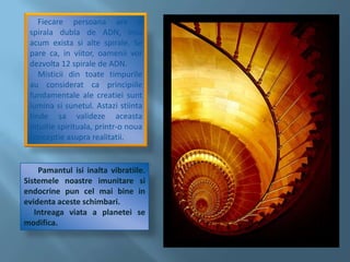 Documentul discută despre viitoarele transformări ale ADN-ului uman, sugerând că oamenii ar putea dezvolta 12 spirale de ADN, ceea ce ar îmbunătăți capacitățile cognitive și intuitivă. Se evidențiază simptomele fizice recente, cum ar fi oboseala și migrenele, care sunt semne ale schimbărilor electrochimice și electromagnetice în corp. În plus, se menționează că oamenii de știință au descoperit doar o parte din ADN-ul activ, iar transformările ADN-ului necesită o deschidere către noi orizonturi spirituale și cognitive.