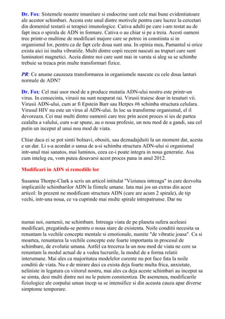 În urma unei revitalizări energetice a sistemului solar, ADN-ul uman suferă modificări evolutive, dovedite de Dr. Berrenda Fox prin teste de sânge care indică formarea de spirale ADN suplimentare. Aceste transformări biologice se manifestă prin simptome fizice și mentale variate, iar indivizii care trec prin aceste schimbări pot dezvolta abilități telepatice. Procesul numit 'ascensiune' implică o creștere a frecvenței vibraționale a corpului, generând o nouă conștiință și o interacțiune diferită cu realitatea.