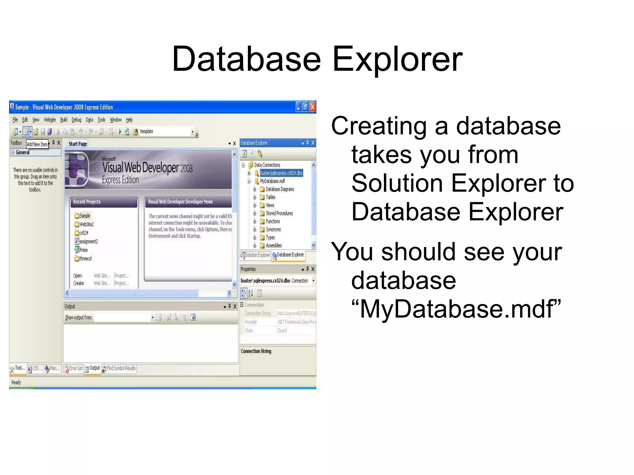 This document provides steps to create a simple web form application in Visual Studio that connects to a SQL database and retrieves data from a table to display on an ASP.NET web page. It describes how to create a database and table, get the connection string, write C# code behind to connect and execute a command to retrieve data from the table, and render the results on the web page.