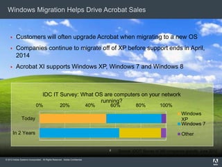 This document provides information to help sell the new Acrobat XI family. It discusses key drivers for upgrading to Acrobat XI like major new features, upgrade and expansion opportunities, and a special guarantee promotion. Details are given on the Acrobat XI product portfolio and highlights of new functionality. Channel sales tools and online certification are also mentioned. Finally, several sales plays are outlined to approach different types of customers and leverage Acrobat XI upgrades, Microsoft migrations, and volume licensing deals.