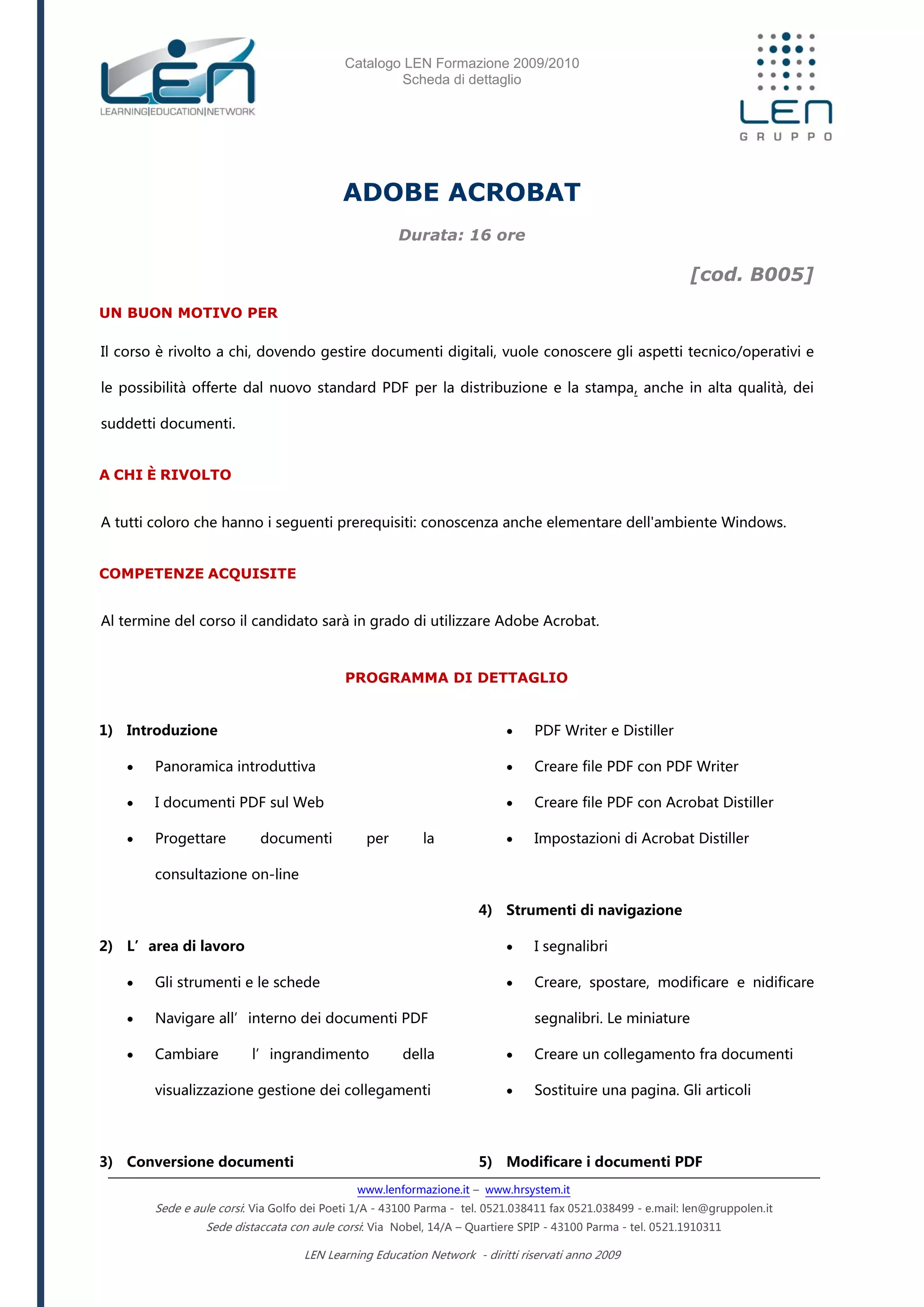 Il documento descrive il corso di formazione su Adobe Acrobat, rivolto a chi gestisce documenti digitali e desidera apprendere le funzionalità del formato PDF. Il programma del corso include la creazione, modifica e distribuzione di documenti PDF, nonché l'uso di strumenti di navigazione e annotazione. Le modalità formative variano tra seminari, workshop e corsi di training, con durate comprese tra 3 e 40 ore.