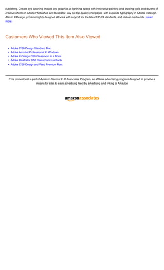 Adobe Creative Suite 6 Design Standard software combines industry-standard tools for professional print design and digital publishing. It includes Photoshop for image editing and video editing, Illustrator for vector graphics, and InDesign for professional page layout and tablet publications. InDesign allows users to create eye-catching eBooks and deliver media-rich publications. The software package provides the tools designers need to create eye-catching images, graphics, print pages, and digital publications at lightning speed.