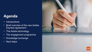The document is an overview of the Adobe ETLA Express Agreement and a webinar scheduled for May 2024, which includes introductions to key participants and an outline of the agenda. It details the costs associated with the new agreement for different user types and discusses an engagement program focused on digital transformation in educational institutions, emphasizing collaboration and community involvement. Next steps encourage institutional participation and outline the support provided by Jisc to maximize the benefits of Adobe technologies.