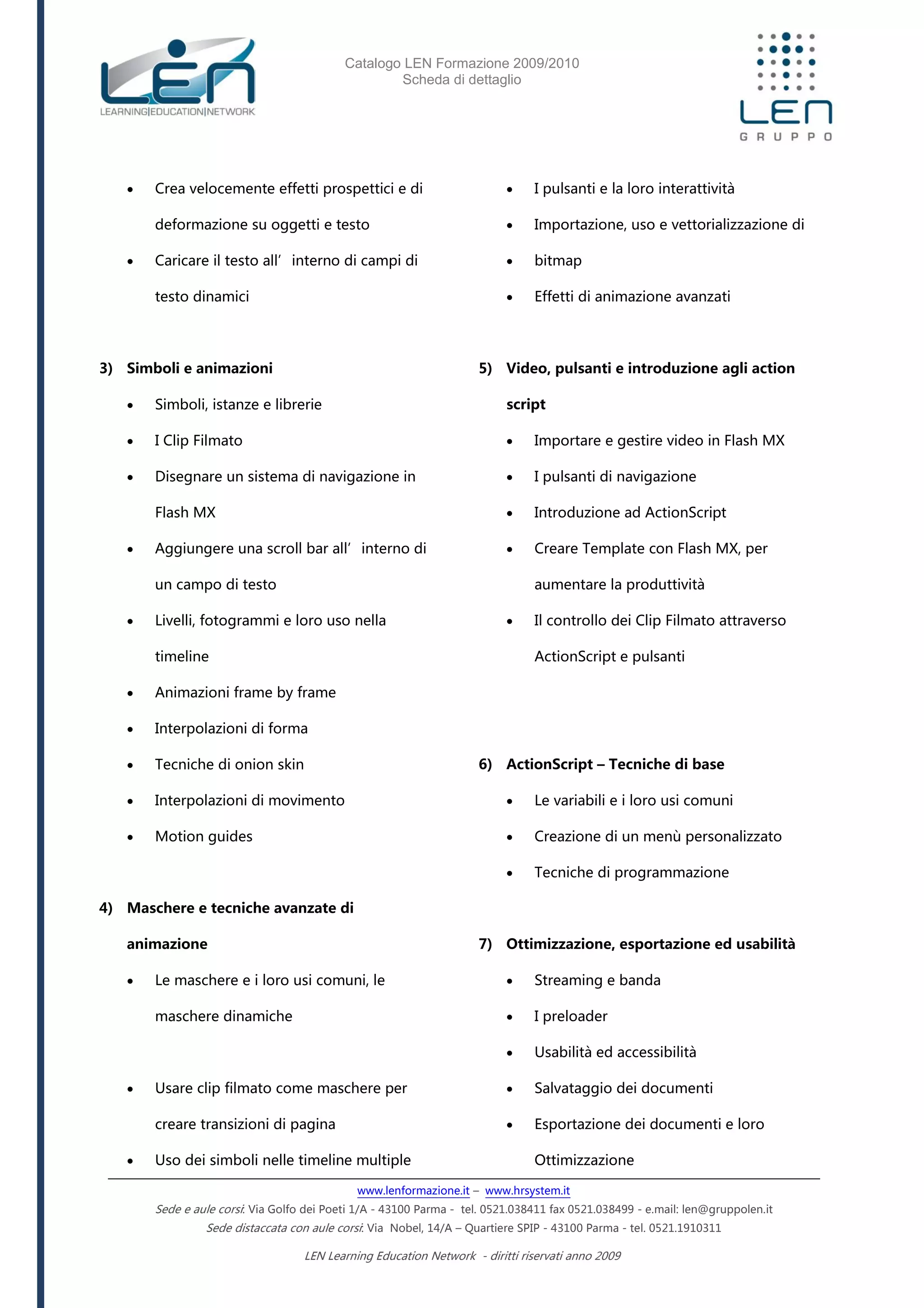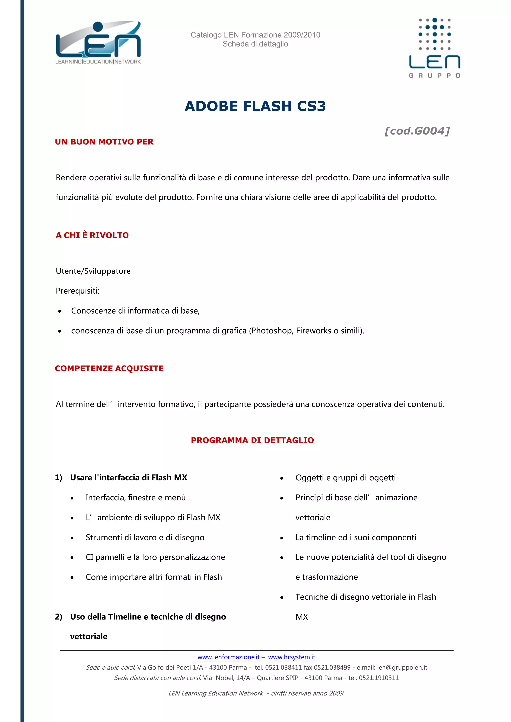 Il documento presenta il catalogo dei corsi di formazione 2009/2010 della LEN, con particolare attenzione al corso su Adobe Flash CS3. Il programma del corso include l'uso dell'interfaccia, tecniche di disegno vettoriale, animazione, utilizzo di maschere, video e introduzione a ActionScript. Sono offerti diversi tipi di formazione, tra cui seminari e workshop, con durate che variano da 3 a 40 ore.
