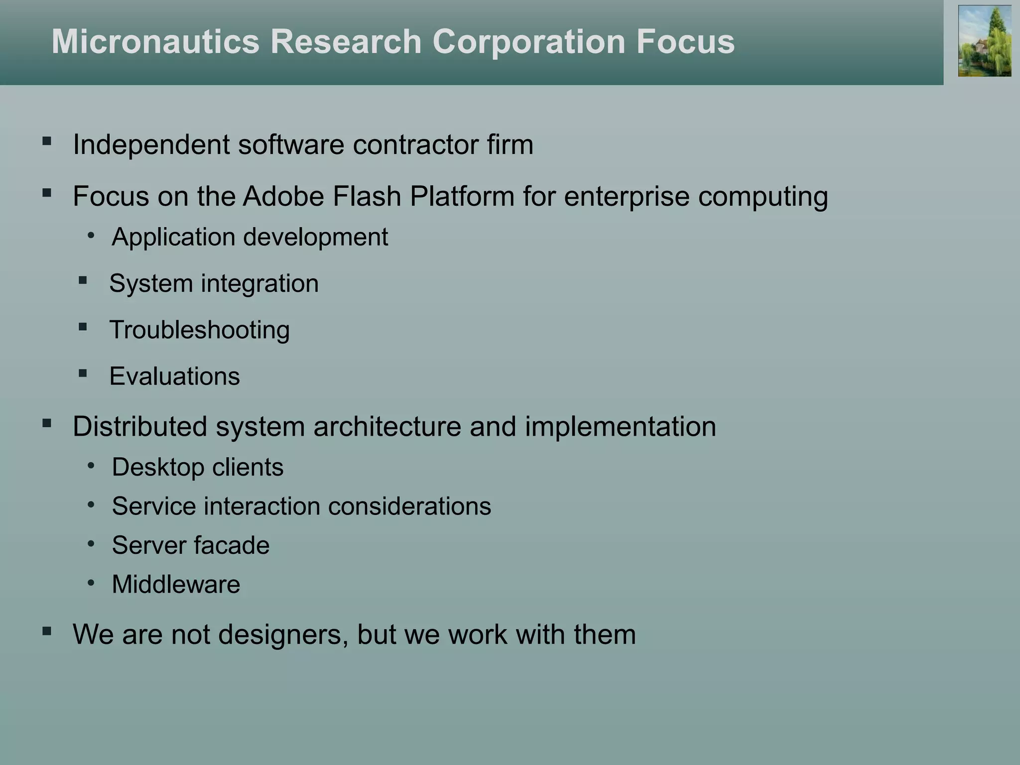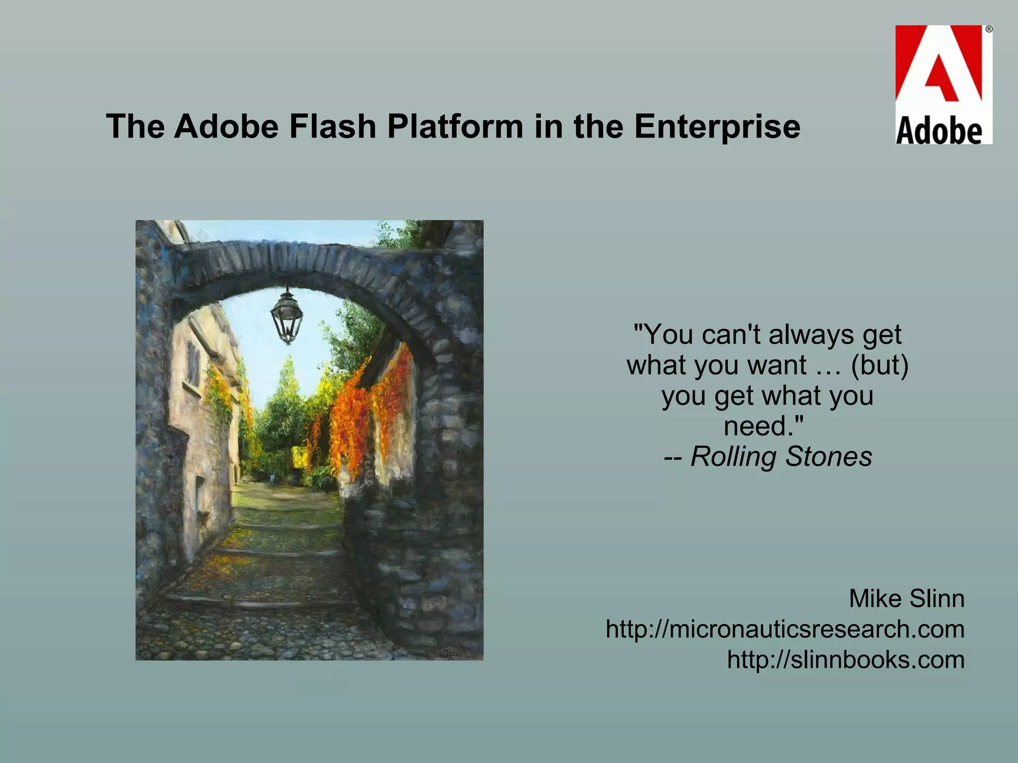 This document summarizes Mike Slinn's presentation on using the Adobe Flash Platform in the enterprise. It discusses enterprise computing and integration topics like visualization for business intelligence, SSL/TLS, single sign-on, web services, and enterprise-wide data services layers. It provides recommendations for distributed computing and integrating Flash and AIR applications within enterprise systems.